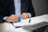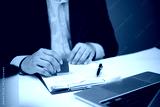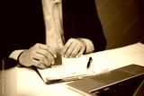 A businessman uses a stamp to approve or sign documents, representing official business or legal processes.