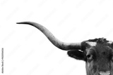 Texas longhorn cow closeup of face with large horn isolated on background in black and white for farm animal art.