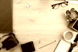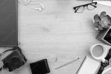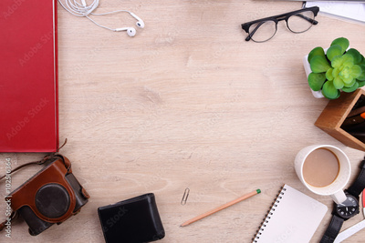 smartphone, book and office supplies on wooden background