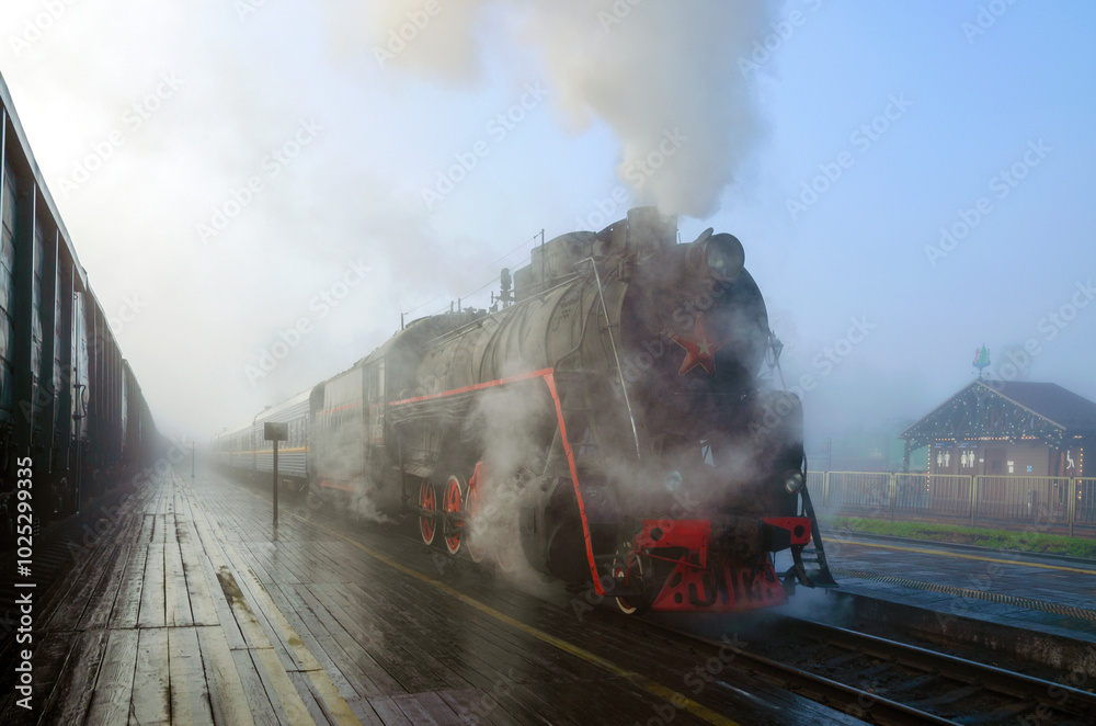 A Soviet steam locomotive of the "L" series on a foggy October morning on the sidings of the Sortavala station.