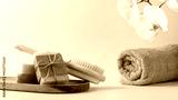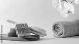 Natural skincare products with a bamboo back brush, handmade soap bars, and a towel