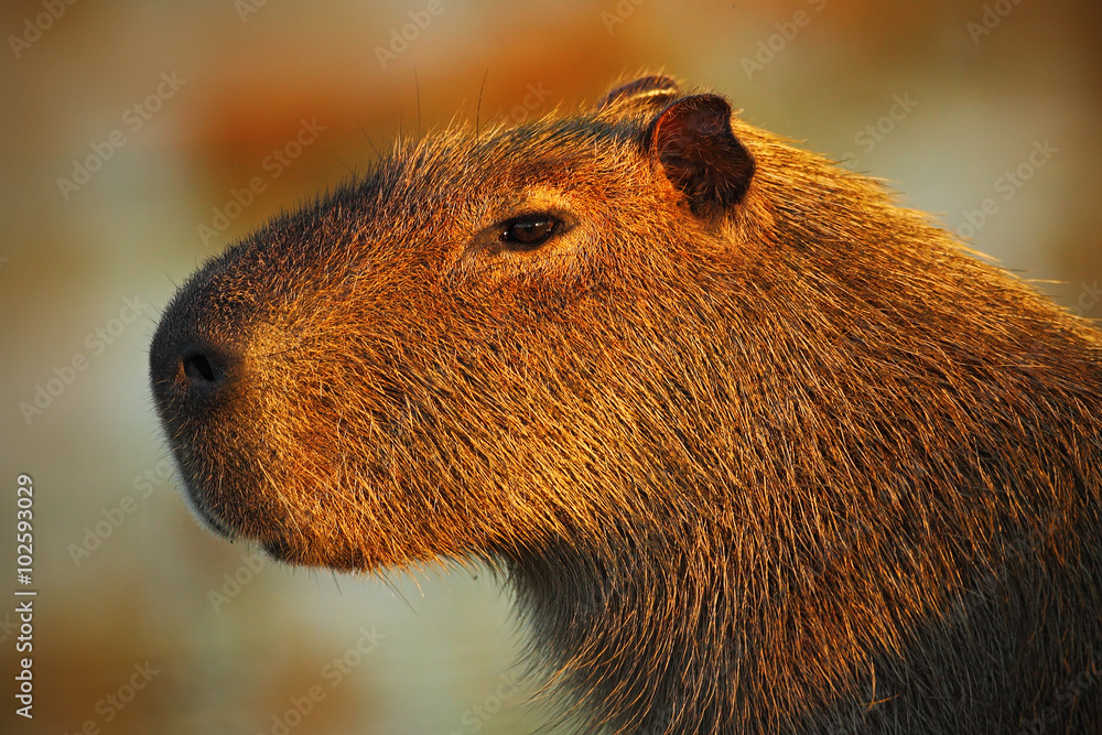 Portrait of biggest mouse around the world, Capybara, Hydrochoerus hydrochaeris, with evening light during sunset, Pantanal, Brazil
