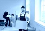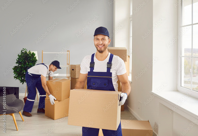 Portrait features a smiling man mover holding a box during an office or home relocation. His demeanor reflects the dedication of a professional providing moving services with a friendly touch.