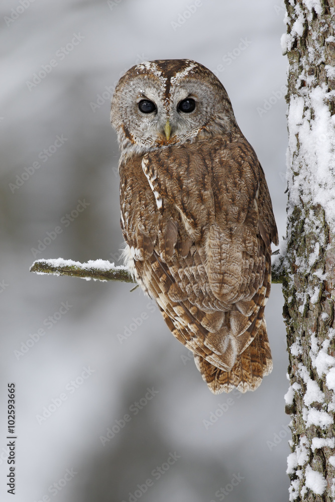 Brown bird Tawny owl sitting on tree trunk with snow during cold winter