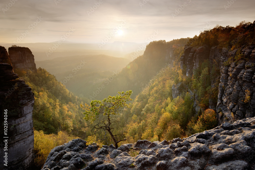 Evening sun during sunset in czech national pak Ceske Svycarsko