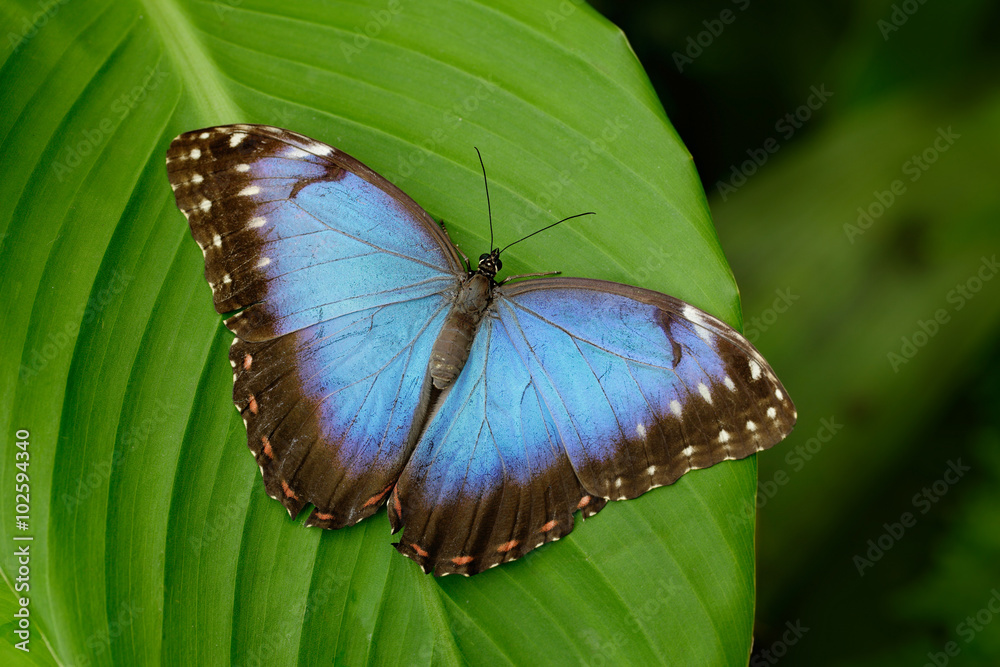 Big Butterfly Blue Morpho, Morpho peleides, sitting on green leaves, Costa Rica