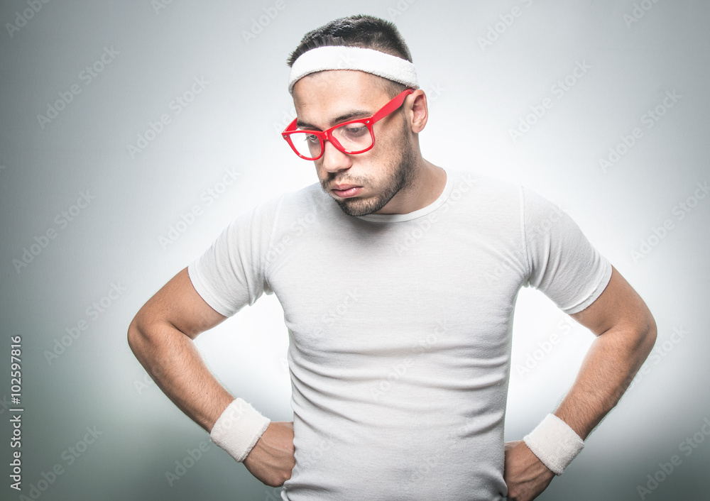 Lazy funny sport man does not wish to doing fitness - exercising...Isolated on gray background. Studio shot