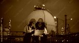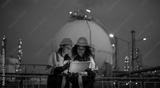 Engineers wearing safety gear, including hard hats examining survey are using tablet collaborating and discussing on screen work plant site use with night lights of oil refinery industry background.