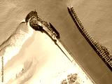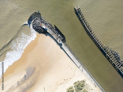 Abstract view of a pair of jetty's on the Suffolk coast. One of the jetty's is being repaired following a storm.