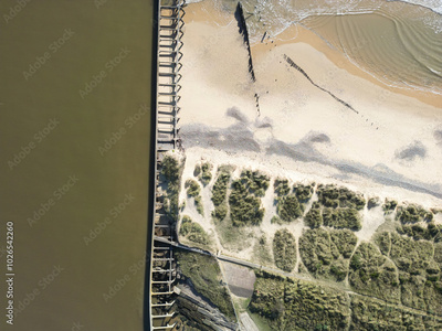 Aerial top down view of an abstract composition of a jetty and beach seen along the popular Suffolk coast during late summer.