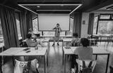 A woman presents to a group of attentive adults in a modern classroom. The atmosphere is collaborative and focused, with participants taking notes and engaging with the speaker.