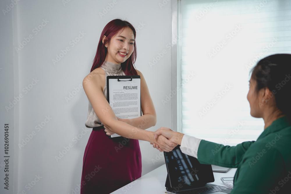 Smiling asian applicant is shaking hands with the human resources manager after a successful job interview