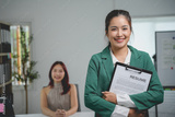Young asian businesswoman holding resume document file folder for a job interview position in an office