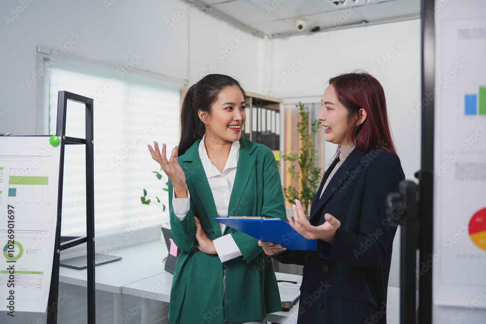 Two smiling businesswomen are discussing work in a modern office, using a clipboard and charts to analyze data and collaborate on a project