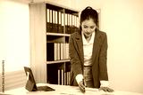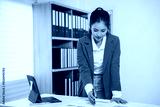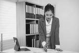 Young asian businesswoman analyzing financial charts and taking notes while standing at her desk in a modern office