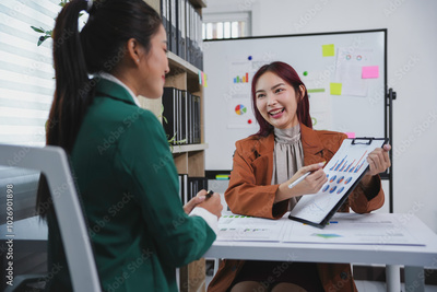 Two businesswomen are having a meeting in a modern office and analyzing charts on a clipboard