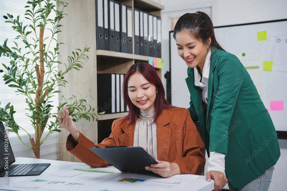 Two young businesswomen are reviewing documents and smiling while working together in their office