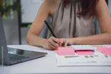 Focused businesswoman in modern office, jotting ideas on sticky notes, working efficiently with laptop and documents, managing tasks with precision