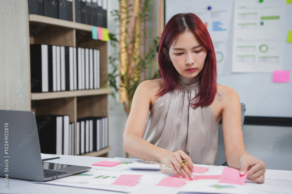 Asian businesswoman is organizing her tasks by writing on sticky notes while sitting at her desk