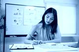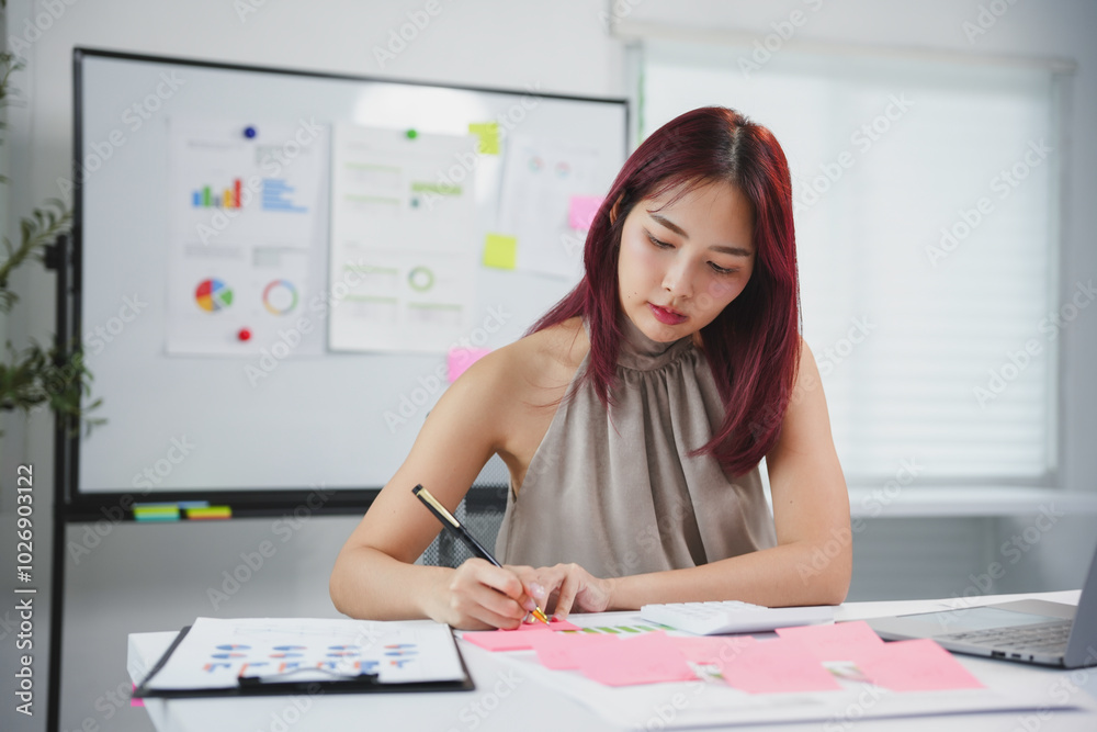 Focused businesswoman analyzing financial data on laptop in modern office, surrounded by papers and sticky notes, exuding ambition and determination