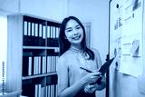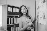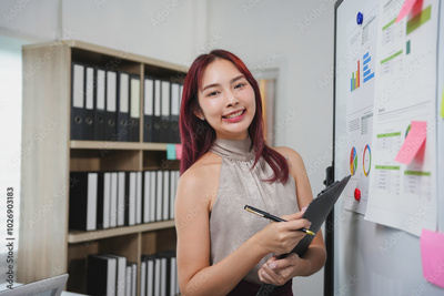Asian businesswoman is holding a clipboard and smiling while standing in an office in front of a whiteboard with graphs and charts on it