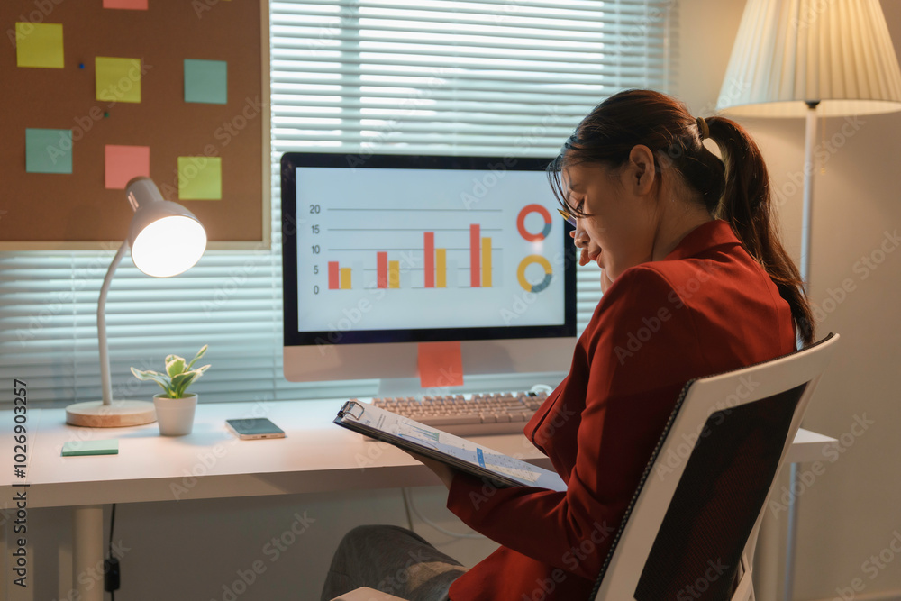Businesswoman is working late, reviewing financial charts and data on her computer and notepad