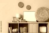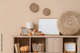 Photo frames, books and pumpkins on shelf unit near beige wall in room