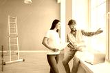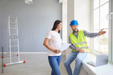 Repairman and female customer looking out the window and planning a home renovation. They engage in a consultation to discuss the project, working enhance the home environment together.