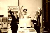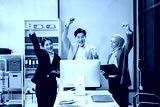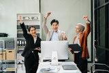 Diverse teams celebrating success in a lively office setting, capturing moments of joy, teamwork,