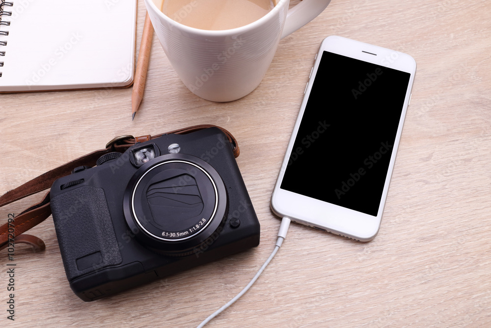 Smartphone mockup with coffee, digital camera and note paper on