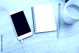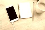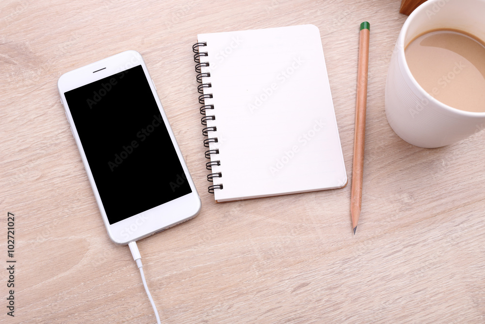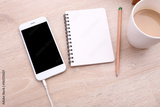 top view smartphone mockup with coffee and note paper on wooden