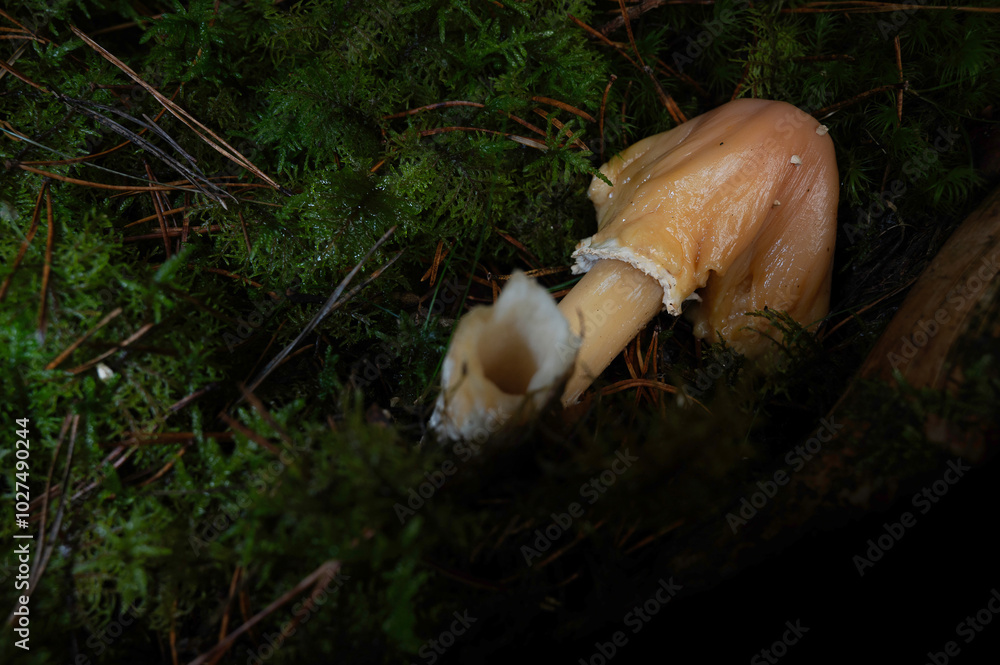 A torn, fallen, broken mushroom in the forest in autumn.
