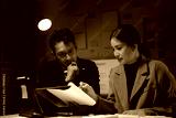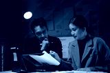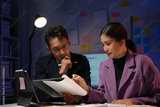 Businessman and businesswoman are working late in the office, illuminated by the glow of a desk lamp as they analyze documents