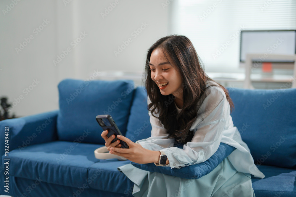 Young woman is sitting on a blue sofa at home, smiling while using her smartphone