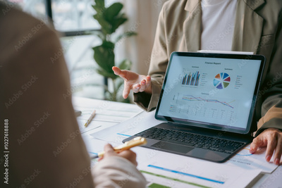 Businesswoman is gesturing while showing charts on a tablet to her colleague during a business meeting