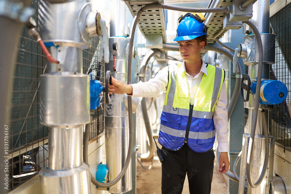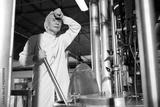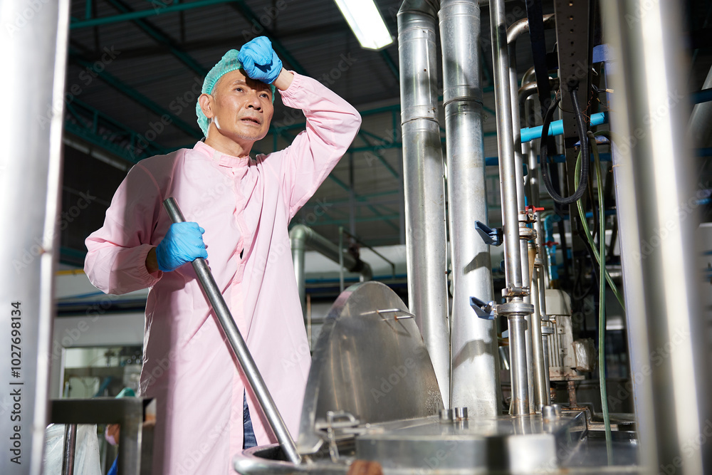 senior worker feeling tired from work beside large industrial pot in the factory