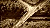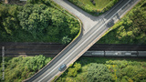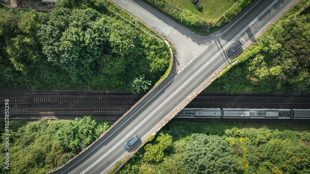 Aerial view of road and rail track in East Sussex, close to Brighton, UK