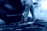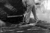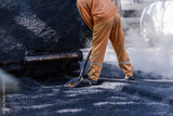 A construction worker spreading asphalt on a road during a sunny day in an urban area, ensuring smooth surface for vehicles