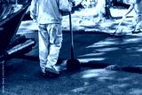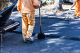 Construction workers repair asphalt surface on a busy street during daylight hours in an urban setting