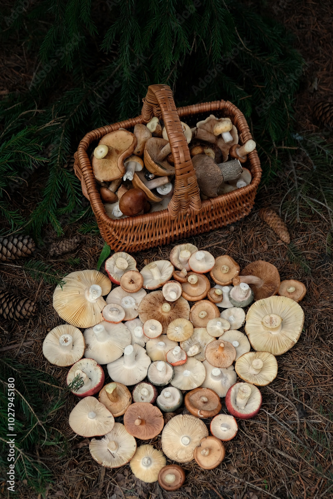 Wicker basket with fresh edible mushrooms and many mushrooms caps in forest, abstract natural background. Beautiful image of wild nature, Forest aesthetic. harvest season, picking fungi