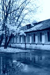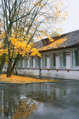 beautiful autumn nature background. landscape with puddle on wet asphalt road, autumnal trees and house, rainy day weather. fall time concept.
