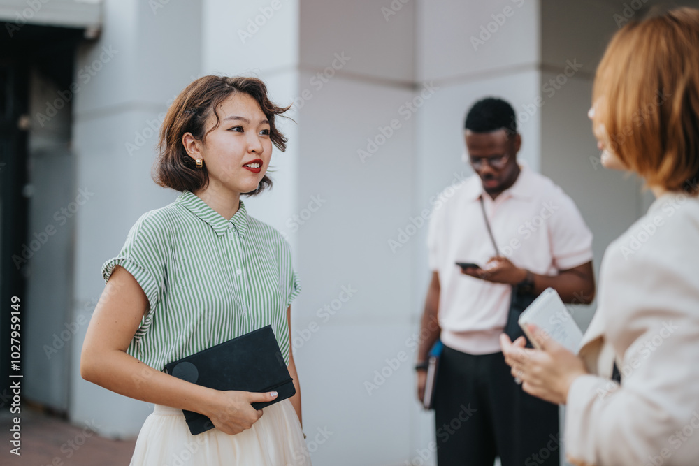 A diverse business team engaged in an outdoor meeting, showcasing teamwork and collaboration in a professional setting. Ideal for business and diversity concepts.
