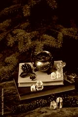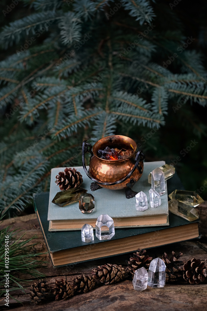 witch cauldron, minerals and spell witch books in forest, natural background. Magic Crystal Ritual. Litho therapy. Witchcraft, spiritual esoteric practice. healing stone therapy for life balance