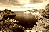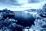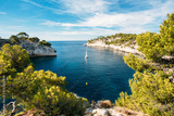 Boat leaves from bay to open sea in Calanques on the azure coast