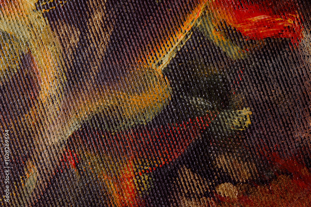 Monochrome linen texture. Strokes of oil paint on a textured canvas. The concept of the modern school of art. Background on a military theme with red and yellow elements.