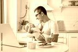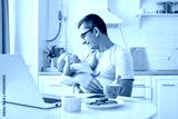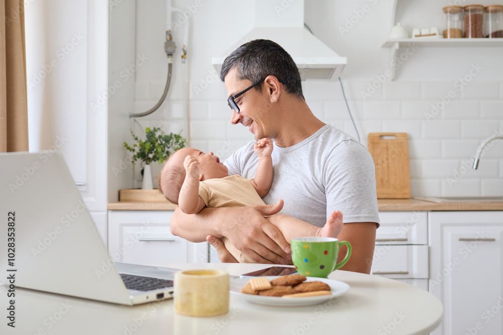Smiling father holding his baby son working on laptop remotely in kitchen using internet balancing between fatherhood and freelance work
