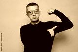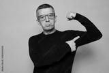 Depressed man in raglan raising his arms with sad expression showing his weak biceps feeling stress and nervousness struggling with personal problems while isolated over beige background