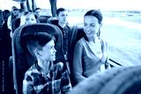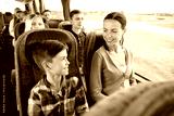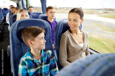 happy family riding in travel bus