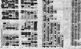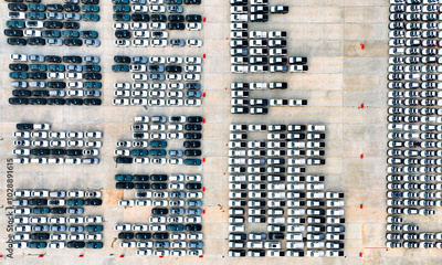 Aerial view of new cars stock at factory parking lot. Above view cars parked in a row. Automotive industry. Logistics business. Import or export new cars at warehouse. Big parking lot at port terminal