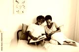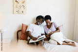 Couple relaxing in bed enjoying leisure time together with books and technology